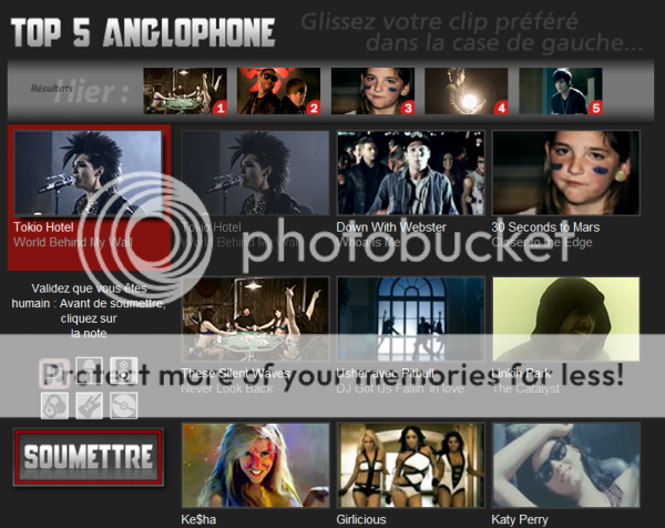 Vota por "World Behind My Wall" de "Tokio Hotel" y para ello, lo único que tienes que hacer es arrastrar la imagen en la ventana de la izquierda con el número 1, y justo debajo da clic en SOUMETTRE y listo.